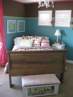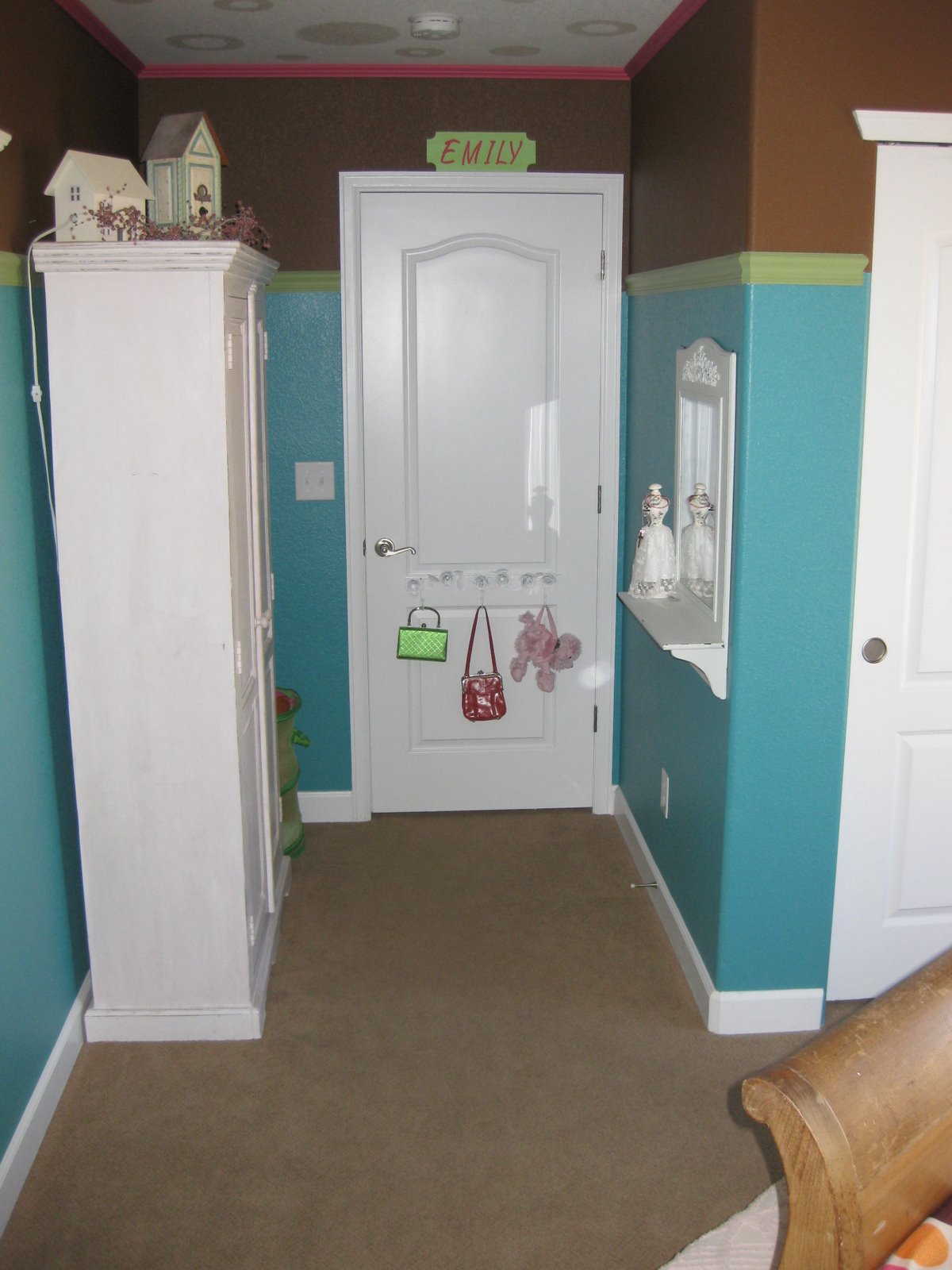 L*O*V*E the room! My mom did the same thing to my room when I went off to camp. Came home to an aqua room as well. I’ll never forget how proud I felt to have a grown up looking room. Em’s is adorable!