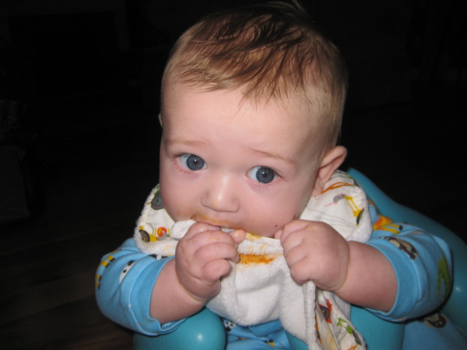 …and he just thought he was getting up to have a yummy bottle. Little did he know that he’d be getting a taste of his very first vittles…