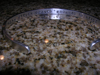 This is Jason’s version of a piercing or tattoo for Noah. He had this bracelet made that says, “NOTHING MISSING * NOTHING BROKEN” on the outside and, “NOAH STEVEN GRAVES * CROWNED IN PEACE” on the inside. It suits Jason perfectly. He got his ears pierced his freshman year of college but those grew in years ago and neither of us really see him as a tattoo guy, though he said he’d get one if I wanted him to. I said nah. Anyway, the bracelet matches his wedding ring that has black Swiss crosses around it. I have a silver necklace that I got probably 10 years ago. I’m going to have it engraved with Noah’s name on it, so will post it as show and tell some day.