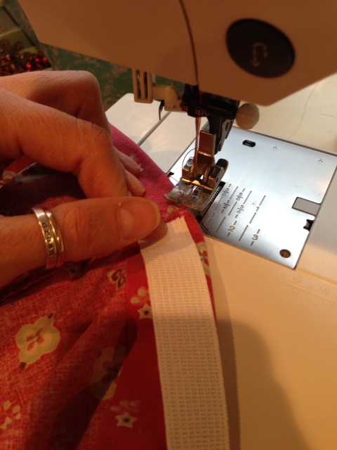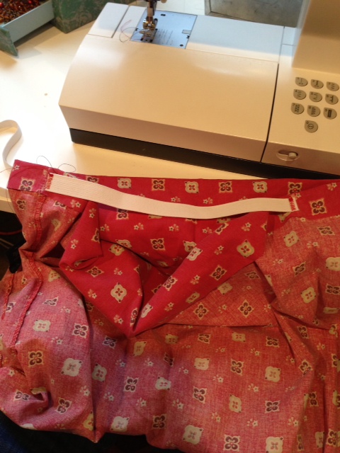 At the natural seem, with one inch of the material folded over but not sewn down, sew one end of the elastic on securely with a zig zag stitch. |